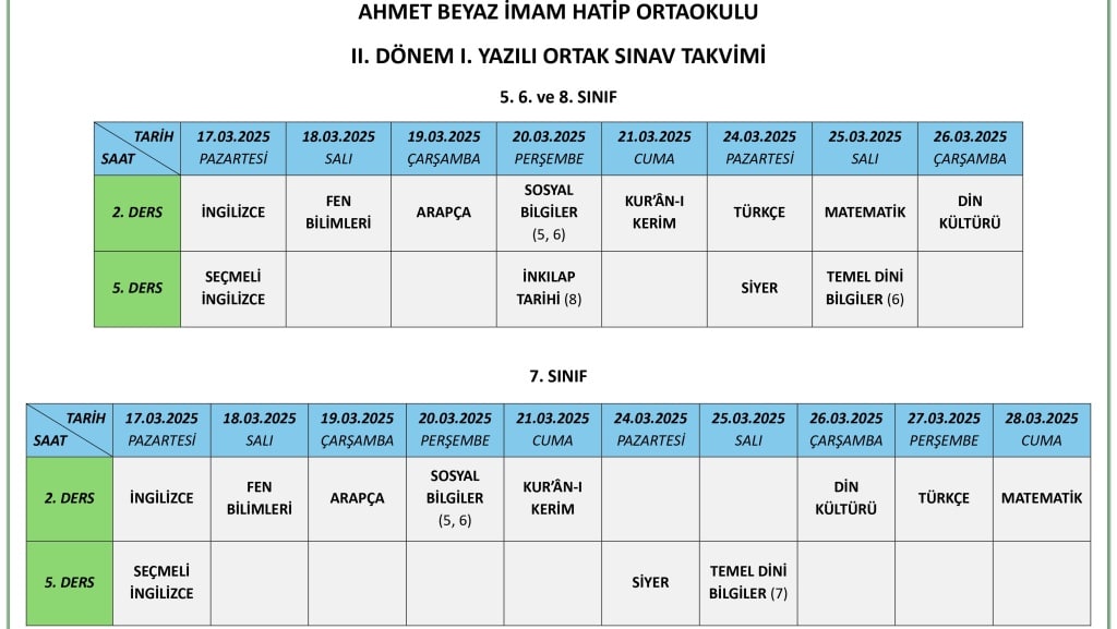 Okulumuz 2024-2025 eğitim öğretim yılı 2. dönem 1. yazılı ortak sınav takvimi yayımlandı. Tüm öğrencilerimze başarılar diliyoruz.